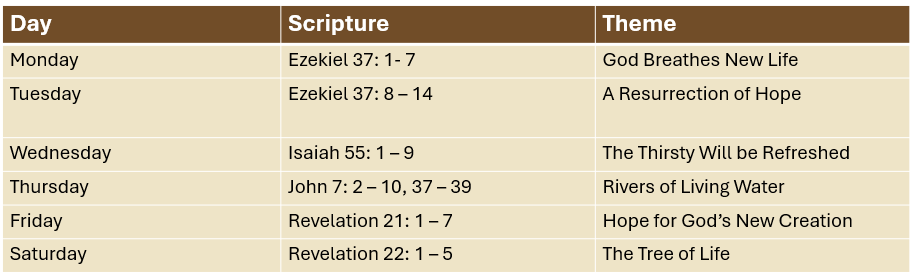Tuesday: Read the assigned scripture passage and note any questions or insights. Attend the online Bible Study session at 12:00 PM